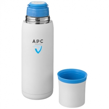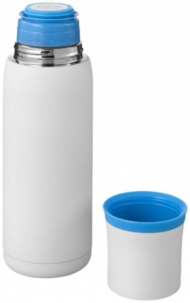 Termos Flow. Termos ma podwójne ścianki ze stali nierdzewnej z izolacją próżniową. Ten typ izolacji zapewnia najdłuższe utrzymanie temperatury. Produkt wyposażony w spust umożliwiający nalewanie oraz kubek w nakrętce. Wierzch kubka oraz spód termosu mają antypoślizgowe silikonowe nakładki. Pojemność 500 ml. Zapakowany w pudełko upominkowe. Wzór zastrzeżony. Stal nierdzewna wewnątrz i na zewnątrz.
