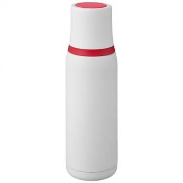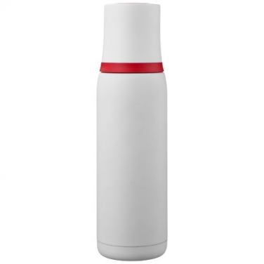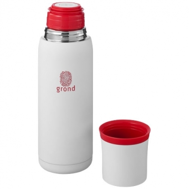 Termos Flow. Termos ma podwójne ścianki ze stali nierdzewnej z izolacją próżniową. Ten typ izolacji zapewnia najdłuższe utrzymanie temperatury. Produkt wyposażony w spust umożliwiający nalewanie oraz kubek w nakrętce. Wierzch kubka oraz spód termosu mają antypoślizgowe silikonowe nakładki. Pojemność 500 ml. Zapakowany w pudełko upominkowe. Wzór zastrzeżony. Stal nierdzewna wewnątrz i na zewnątrz.