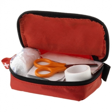 Zestaw pierwszej pomocy 19-częściowy. 5 plastrów, 4 waciki nasączone alkoholem, bandaż, chustę trójkątną, 2 agrafki, 5 szt. gazy oraz nożyczki, całość w etui z nylonu. Produkt zgodny z normą EN13485. Nylon 70D.