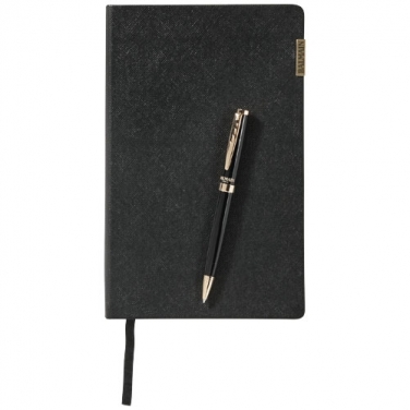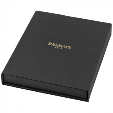 Zestaw upominkowy z notesem. Objęty wzorem zastrzeżonym notatnik (format A5) z okładką z poliuretanu Thermo, zawiera 80 kremowych kartek (80 g/m²) w linie, ze złotymi krawędziami. Dołączono długopis z mechanizmem przekręcanym, zapakowany w pudełko upominkowe Balmain. Wymiary notatnika: 13.2 x 21.3 cm. Długość długopisu: 13.7 cm. Średnica długopisu: 1.2 cm. Poliuretan Thermo.