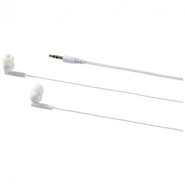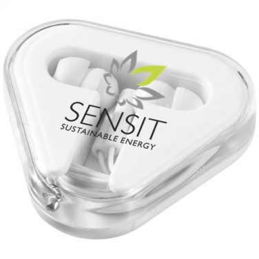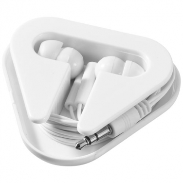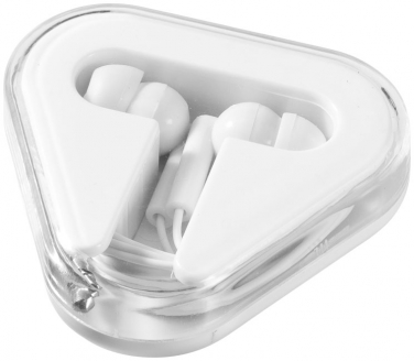 Słuchawki douszne Rebel. Plastikowe trójkątne etui z miejscem na schowanie kabla. Słuchawki kompatybilne z każdym standardowym urządzeniem z audio jack 3,5 mm. Plastik.