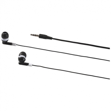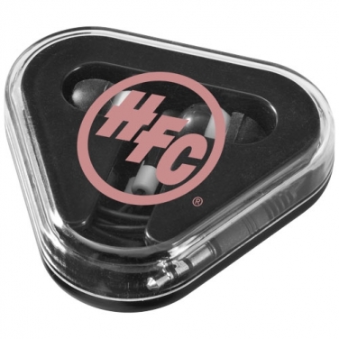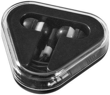 Słuchawki douszne Rebel. Plastikowe trójkątne etui z miejscem na schowanie kabla. Słuchawki kompatybilne z każdym standardowym urządzeniem z audio jack 3,5 mm. Plastik.