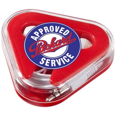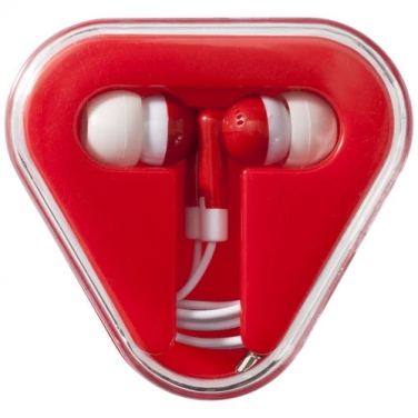Słuchawki douszne Rebel. Plastikowe trójkątne etui z miejscem na schowanie kabla. Słuchawki kompatybilne z każdym standardowym urządzeniem z audio jack 3,5 mm. Plastik.