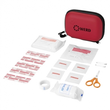 Zestaw pierwszej pomocy 16-częściowy. Etui EVA zawiera: 4 waciki z alkoholem, 1 gąbkę non woven, 5 plastrów opatrunkowych, 1 plaster bez opatrunku, 1 bandaż, nożyczki, 2 agrafki i 1 chustę trójkątna. Produkt zgodny z normą EN13485. Etui EVA.