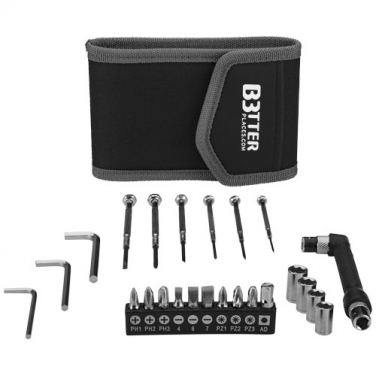 Zestaw narzędzi 24 części. Ten 24 częściowy zestaw narzędzi zapakowany w etui z poliestru 600D zawiera 6 częściowy zestaw mini śrubokrętów, jeden gumowy uchwyt, 9 końcówek w uchwycie 3x Philips (PH1, PH2, PH3), 3x płaskie (4, 6, 7mm), 3x PZ (PZ1, PZ2, PZ3), 1x adapter, 4 końcówki kluczy nasadowych (7mm, 8mm, 9mm, 10mm) oraz 3x imbus (rozmiar 3,4,5). Zapakowany w pudełko upominkowe STAC. Poliester 600D.