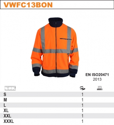 Dostępne w dwóch kontrastowych kolorach: VWFC13BON fluorescencyjnym pomarańczowym/granatowym VWFC13BYN fluorescencyjnym żółtym/granatowym Wykonane z niemechacącego się polaru Podszewka z siateczki 100% poliestru Dwie kieszenie boczne ijedna na piersi zapinane na zamek Rozmiary: S, M, L, XL, XXL, XXXL