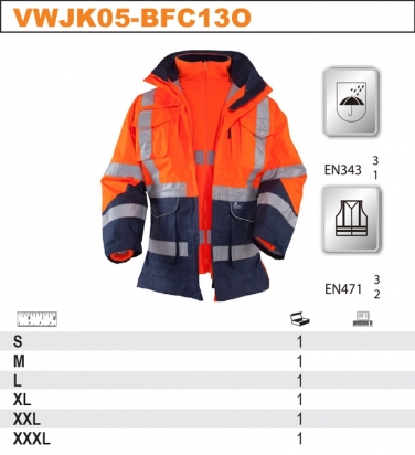 Dostępna w dwóch fluorescencyjnych kolorach: - VWJK05-BYN fluorescencyjnym żółto/granatowym - VWJK05-BON fluorescencyjnym pomarańczowo/granatowym - Wodoodporne klejone szwy - Zapinana na zatrzaski kryte listwą - Kaptur chowany w kołnierzu - Pobokach u dołu kurtki wywietrzniki zapinane na guziki - Lewa kieszeń na piersi z patką i schowanym zamkiem - Mankiety z zapięciem na rzep pozwalającym na regulację - Innowacyjna tkanina Ripstop zapewnia dłuższą trwałość i odporność przedrozerwaniem i otarciami