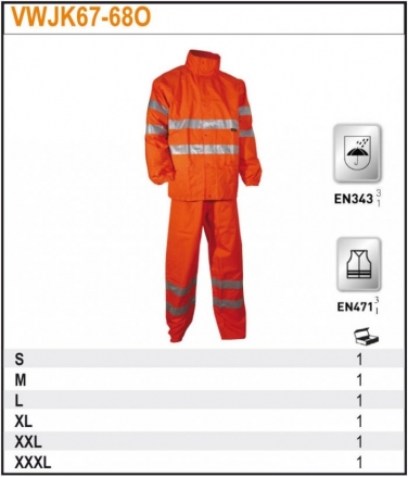 Komplet przeciwdeszczowy ostrzegawczy o intensywnej widzialności pakowany w worek zapinany na zamek Dostępny w dwóch kolorach: VWJK67-68Y fluorescencyjnym żółtym VWJK67-68O fluorescencyjnym pomarańczowym VWJK67 Kurtka przeciwdeszczowaostrzegawcza o intensywnej widzialności - Wykonana z materiału: 100% poliestru Oxford 150D powlekanego poliuretanem - Wodoodporna i wiatroodporna - Kaptur ze sznurkiem ściągającym, przypinany na zatrzaski - Szwy uszczelnione , klejone - Dwiekieszenie zewnętrzne zapinane na zatrzaski - Elastyczne ściągacze na nadgarstkach - Szczelina wentylacyjna na plecach VWJK68 Spodnie przeciwdeszczowe ostrzegawcze o intensywnej widzialności - Wykonane z materiału: 100% poliestru Oxford 150Dpowlekanego poliuretanem - Wodoodporne i wiatroodporne - Szwy uszczelnione, klejone, elastyczny ściągacz w pasie, bez podszewki - Dół nogawek zapinany na zatrzask