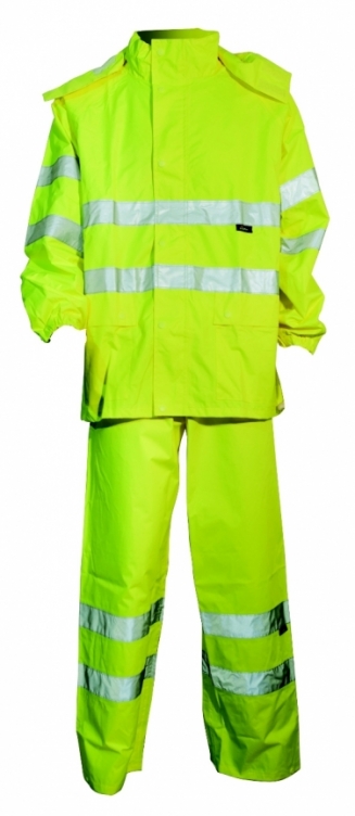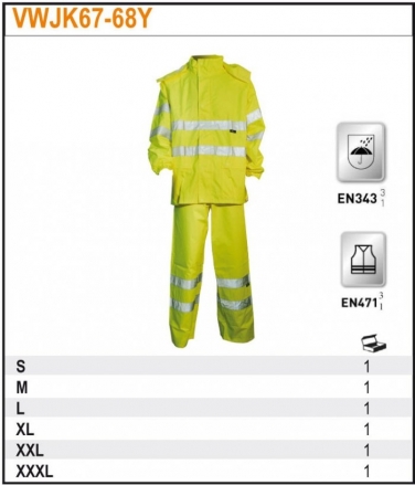 Komplet przeciwdeszczowy ostrzegawczy o intensywnej widzialności pakowany w worek zapinany na zamek Dostępny w dwóch kolorach: VWJK67-68Y fluorescencyjnym żółtym VWJK67-68O fluorescencyjnym pomarańczowym VWJK67 Kurtka przeciwdeszczowaostrzegawcza o intensywnej widzialności - Wykonana z materiału: 100% poliestru Oxford 150D powlekanego poliuretanem - Wodoodporna i wiatroodporna - Kaptur ze sznurkiem ściągającym, przypinany na zatrzaski - Szwy uszczelnione , klejone - Dwiekieszenie zewnętrzne zapinane na zatrzaski - Elastyczne ściągacze na nadgarstkach - Szczelina wentylacyjna na plecach VWJK68 Spodnie przeciwdeszczowe ostrzegawcze o intensywnej widzialności - Wykonane z materiału: 100% poliestru Oxford 150Dpowlekanego poliuretanem - Wodoodporne i wiatroodporne - Szwy uszczelnione, klejone, elastyczny ściągacz w pasie, bez podszewki - Dół nogawek zapinany na zatrzask