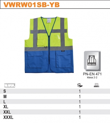 KAMIZELKA Z WIELOMA KIESZENIAMI, ZAPINANA NA ZAMEK, OSTRZEGAWCZA O INTENSYWNEJ WIDZIALNOŚCI, W KONTRASTOWYCH KOLORACH, ŻÓŁTO-NIEBIESKA, MODEL VWRW01SB-YB