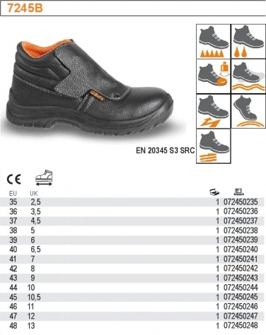 - Trzewiki bezpieczne skórzane, wodoodporne ( wierzch nie przepuszcza wody przez minimum 1 godz. ) - Podnosek stalowy ( wytrzymuje uderzenia do 200J ) - Wkładka antyprzebiciowa stalowa o dużej elastyczności - Sznurowane, z systemem szybkiegozdejmowania - Posiadają osłonę sznurówek zapinaną na rzep - Rozmiary: 35 - 48 - EN 20345 S3 RS SRC - CE