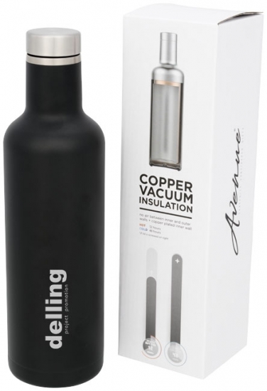 Butelka z izolacją próżniową Pinto. Trzymaj napoje gorące przez 12 godzin lub przez 48 godzin na zimno za pomocą izolowanej próżniowo butelki Pinto. Podwójnie ściankowane i wykonane ze stali nierdzewnej o grubości 18/8 z izolacją próżniową i miedzianą ścianą wewnętrzną oznaczają, że napój jest utrzymywany w gorącej lub lodowatej wodzie w zależności od wymagań. Zawiera powłokę proszkową na zewnętrznym korpusie. Pojemność objętościowa to 750 ml. Prezentowany w pudełku upominkowym Avenue. Stal nierdzewna.