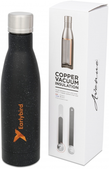 Butelka izolowana próżniowo Vasa. Zachowaj napoje gorące przez 12 godzin lub przez 48 godzin zimne w izolowanej butelce próżniowej Vasa. Podwójnie ściankowane i wykonane ze stali nierdzewnej o grubości 18/8 z izolacją próżniową i miedzianą ścianą wewnętrzną oznaczają, że napój jest utrzymywany w gorącej lub lodowatej wodzie w zależności od wymagań. Butelka charakteryzuje się modnym, nakrapianym wykończeniem. Pojemność objętościowa to 500 ml. Prezentowany w pudełku upominkowym Avenue. Stal nierdzewna.