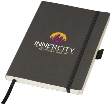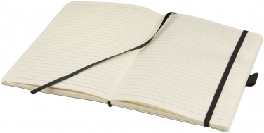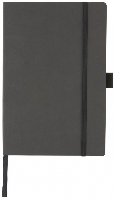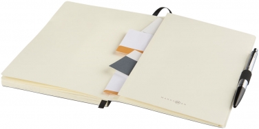 Notes Revello. Elastyczny notes w miękkiej oprawie (rozmiar A5) z wbudowaną elastyczną klapką, wstążką, pętelka na długopis, kieszenią na dokumenty po wewnętrznej stronie tylnej okładki i 80 kremowymi kartkami (80 gsm) w linie. Czarne opakowanie. Imitacja skóry PU.
