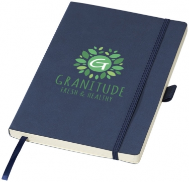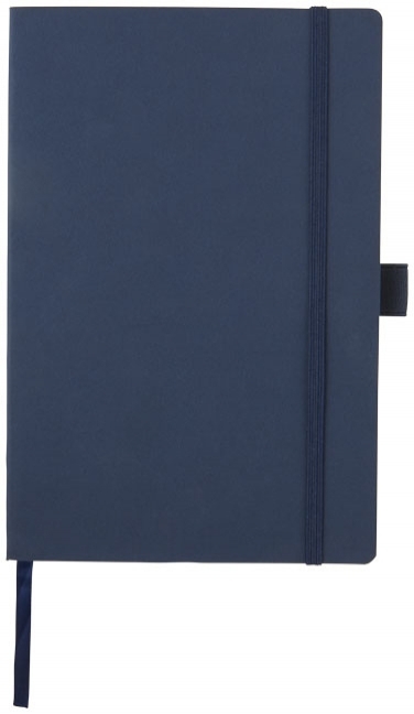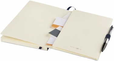 Notes Revello. Elastyczny notes w miękkiej oprawie (rozmiar A5) z wbudowaną elastyczną klapką, wstążką, pętelka na długopis, kieszenią na dokumenty po wewnętrznej stronie tylnej okładki i 80 kremowymi kartkami (80 gsm) w linie. Czarne opakowanie. Imitacja skóry PU.