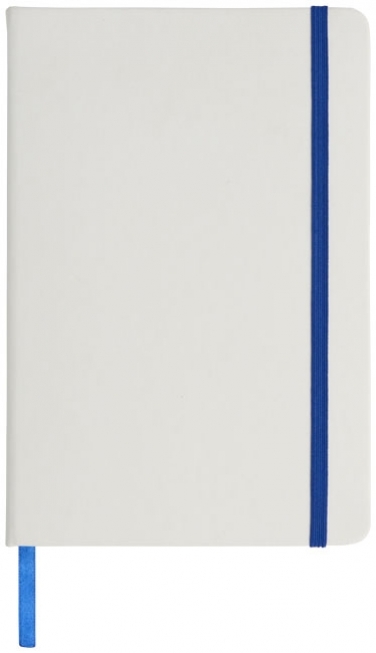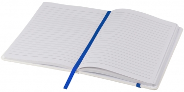 White A5 notebook with coloured elastic closure and ribbon. Includes 96 sheets (60g/m2) lined paper. Digital print possible on cover.