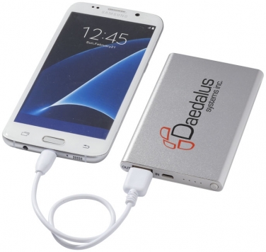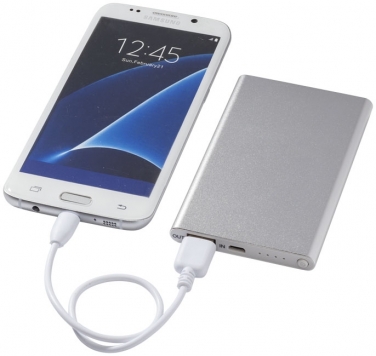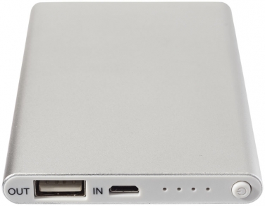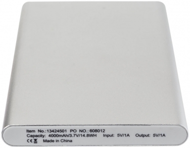 Aluminiowy power bank Pep 4000 mAh. Wąski, lekki, aluminiowy power bank z litowo-polimerowym akumulatorem klasy A o pojemności 4000 mAh. Kontrolka LED świeci się podczas ładowania i pokazuje stan naładowania power banku. Moc pobierana 5 V/1 A, moc wyjściowa 5 V/1 A. W zestawie z kablem USB. Pakowany w białe pudełko upominkowe. Aluminium.
