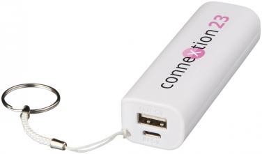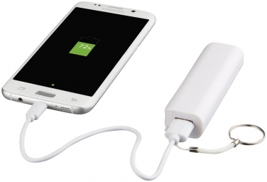 Power bank Span 1200 mAh. Power bank z litowo-jonowym akumulatorem 1200 mAh, naładuje smartfon, odtwarzacz MP3 i wiele innych urządzeń. Posiada też kółko, dzięki czemu może służyć jako brelok. W zestawie z kablem micro USB. Napięcie wejściowe 5 V/1 A, wyjściowe 5 V/1 A. Pakowany w białe pudełko upominkowe. Plastik.