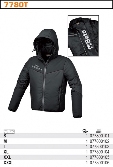7780T Kurtki krótkie watowane z kapturem 100% poliestru 300D, wytrzymałe i wodoodporne. Wstawki elastyczne dla wygodniejszego noszenia, ale także wodoodporne 95% poliester, 5% elastan Podszewka 100% poliester Watowanie 100% poliester , 160 g/m2r watowany z podszewką i sznurkami do regulacji pod szyją Dwie kieszenie po bokach zapinane na zamki Jedna kieszeń na prawej piersi ( pod LOGO BETA ) zapinana na zamek, w środku z przymocowaną oprawką na identyfikator Jedna wewnętrzna pozioma kieszeńana na zamek Dwie pionowe kieszenie wewnętrzne zapinane na zamki Kieszeń zewnętrzna na lewym ramieniu zapinana na zamek Kaptur i mankiety wykończone elastyczną taśmą dla większej wygody używania Kolor czarny Rozmiary: S, M, L, XL, XXL, XXXL MARKA -
