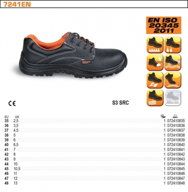 Półbuty bezpieczne S3 z wkładką antyprzebiciową wykonaną ze stali o dużej elastyczności oraz ze stalowym noskiem wytrzymującym uderzenie do 200J. Podeszwa olejoodporna, antystatyczna o najlepszych właściwościach antypoślizgowych SRC, wykonana z poliu PU o podwójnej gęstości, odporna na kwasy i materiały ropopochodne. System amortyzacji uderzeń SAS: absorpcja energii w części piętowej jest kluczowa dla komfortu użytkownika. Wkładka Carbon wykonana z perforowanego filcu, antystatyczna, antygrza. Gumowe wykończenie podnoska, zapobiegające wrzynaniu się podnoska w stopę. Wielowarstwowa podszewka 3D, bardzo przewiewna o dużej odporności na ścieranie. Miękka wstawka w części piętowej poprawiająca komfort użytkowania. Półbuty wodoodporne wne z oddychającej skóry. EN 20345 S3 SRC