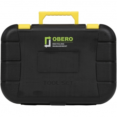 Skrzynka narzędziowa 16-częściowa Soúnion. Skrzynka narzędziowa z wysuwanym mechanizmem zamykania zawiera młotek ciesielski, 3,5m taśmę mierniczą, klucz małpę, nóż uniwersalny z funkcją blokowania, poziomicę, 8 kluczy imbusowych (1,5-6 mm) w uchwycie, długie szczypce, przecinak do drutu, śrubokręt z testerem napięcia, 4 wkrętaki precyzyjne (płaskie i Philips) i końcówki do wkrętaka z 10 bitami (PH, PZ, płaski, hex i adapter) w uchwycie. ABS tworzywo sztuczne.