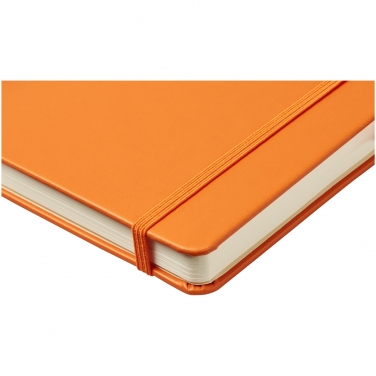 Kołonotatnik A5 Nova. Notatnik skóropodobny z imitacji skóry A5 (14,2 cm x 21,4 cm) z elastyczną gumką, zakładką, pętlą na pióro i harmonijkową tylną kieszenią. Zawiera 96 arkuszy papieru w linie w gramaturze 80 g/m2 i jest oferowany w białej obwolucie typu Journalbook. Papier skóropodobny.