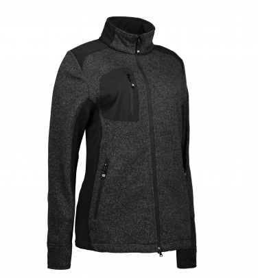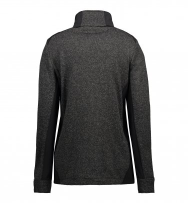 Stylowa damska bluza z polaru z przędzy w kolorze melanżowym. Wstawki softshellowe w kontrastowym kolorze. Dwukierunkowy zamek błyskawiczny na całej długości. U dołu regulacja gumką. Dwie kieszenie po bokach i jedna na piersi, wszystkie zapinane na zamki błyskawiczne. Lekko dopasowana.