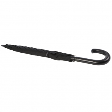 Parasol z funkcją automatycznego otwierania z czaszą wykonaną z poliestru pongee i z solidnym metalowym trzonkiem w kolorze czarnym. Wysokiej jakości pełny stelaż z włókna szklanego zapewnia maksymalną elastyczność przy wietrznej pogodzie. Zakrzywiona rączka z wykończeniem o optyce karbonowej i niklowanymi końcówkami w kolorze czarnym. Markowe detale Luxe na tkanej etykiecie na czaszy i na pasku do zapinania. Duża powierzchnia dekoracyjna na każdym z paneli.