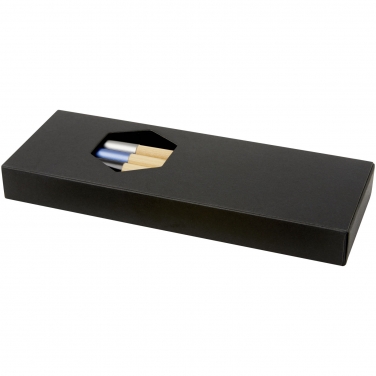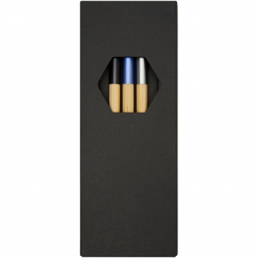 Zestaw długopisów o ekskluzywnym wzornictwie, składający się z trzech długopisów z kolorowym akcentem. Pióro kulkowe z niebieską blaszką aluminiową jest fabrycznie napełniane niebieskim wkładem, podczas gdy pozostałe dwa pióra – czarnym. Zapakowany w czarne pudełko upominkowe.