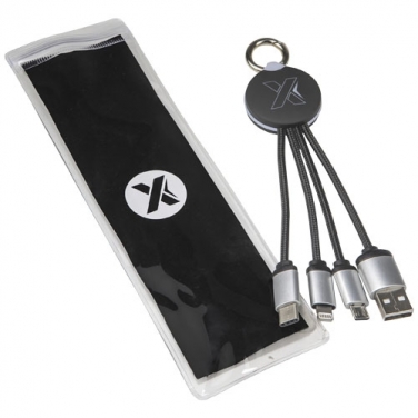 Kabel do ładowania z podświetlanym logo z gumowanym i metalowym wykończeniem wyposażony w trzy złącza (USB typu C, Android, iPhone). Umożliwia jednoczesne ładowanie do trzech urządzeń. Długość kabli (łącznie z wtyczkami): 10 cm. Opakowanie wykonane jest z papieru i tworzywa sztucznego z recyklingu.