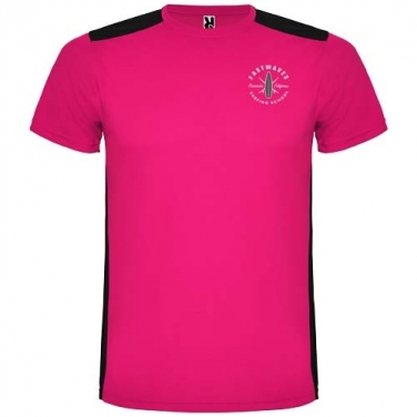 Łatwoschnący, techniczny i oddychający materiał. Okrągły kołnierzyk. Połączenie dwóch materiałów poliestrowych na plecach i ramionach. Materiał o splocie Birdseye z przodu i oddychająca siateczka 3D z tyłu. Materiał przygotowany na wchłanianie wilgoci. Ozdobny ścieg zygzakowy po bokach i na ramionach. Wzór na plecach nieco dłuższy. Usuwalna etykieta.