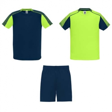 Zestaw składa się z 2 koszulek i 1 pary spodenek. Kolorystyka drugiej koszulki została zaprojektowana odwrotnie niż pierwszej. Techniczny i oddychający materiał. T-shirty z półraglanowymi rękawami z nadrukiem. Okrągły dekolt z trykotem na plecach. Elastyczny pas w spodenkach z dopasowanym wewnętrznym sznurkiem z zabezpieczającymi szwami. Spodenki z kontrastowym paskiem po bokach i rozcięciami u dołu. Usuwalna etykieta.