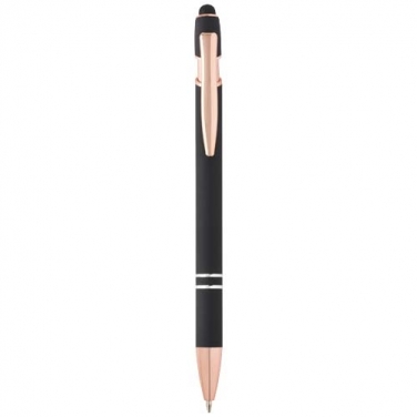 Długopis Nanna z wykończeniem w kolorze różowego złota ma korpus wykonany z aluminium z recyklingu i rysik dotykowy wykonany z silikonu. Aluminium z recyklingu ogranicza ilość odpadów na wysypiskach śmieci i pomaga chronić zasoby naturalne w celu zmniejszenia emisji gazów cieplarnianych. Kolor tuszu: Niebieski. Żywotność: 800 metrów. Rozmiar stalówki: 1,0 mm.