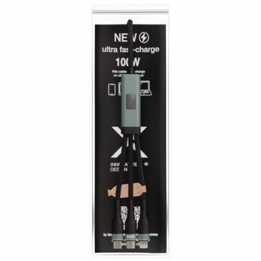 Kabel do ultraszybkiego ładowania 5 w 1 o mocy 100 W z tworzywa sztucznego rPET, który umożliwia ładowanie smartfonów, tabletów i laptopów. Podwójne wejście USB-A + USB-C sprawia, że kabel jest w 100% kompatybilny z najnowszymi modelami komputerów. Moc: Typ C, Micro USB i Lightning. Dostarczany z nadającym się do recyklingu etui z TPU i wkładką z papieru z recyklingu. Długość kabla: 1 metr.