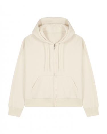 Wszywane rękawy Opadające ramiona Podwójnie podszyty kaptur z tego samego materiału Płaski sznurek w kolorze materiału Haftowane oczko Metalowy zamek błyskawiczny ukryty na środku z przodu Ściągacz 1x1 przy kołnierzu, mankietach i u dołu Podwójne szwy na wszystkich szwach Grosgrain wewnątrz kołnierza Półksiężyc z tego samego materiału na karku