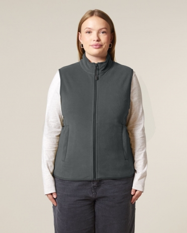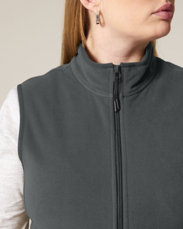 Bez rękawów Elastyczne wykończenie krawędzi przy szyi, otworu na ramię i dołu Pętelka z taśmy rypsowej wewnątrz na karku Zamek błyskawiczny z nylonowej cewki z metalowym uchwytem i zakończeniem ze sznurka Szczotkowany materiał z wykończeniem przeciwmechaceniowym po wewnętrznej i zewnętrznej stronie Boczne kieszenie z przodu z otworem na zamek Taśma na karku wewnątrz z recyklingowanego poliestru
