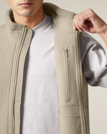 Bez rękawów Elastyczne wykończenie z recyklingu na mankietach i u dołu Pętla przy karku i taśma na karku Plastikowy zamek Vislon z metalowym suwakiem i zakończeniem sznurka Wnętrze wyłożone polarem z wykończeniem przeciw mechaceniu Przednie kieszenie typu welt z kontrastowej tkaniny softshell, z ukrytym zamkiem Kontrastowy materiał softshell na kieszeni, plecach i zewnętrznej stronie kołnierza Niewidoczny zamek wewnętrzny po lewej stronie klatki piersiowej dla łatwej dekoracji