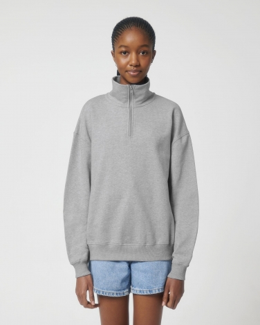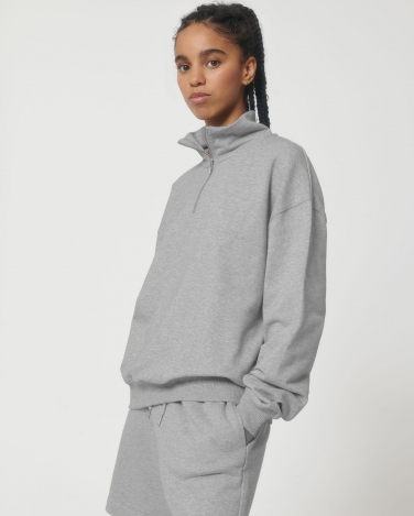 Wszywane rękawy Kołnierz z tego samego materiału Taśma w jodełkę wewnątrz kołnierza i zamka Zamek błyskawiczny na ćwierć długości na środku z przodu Ściągacz 2x1 u dołu rękawów i u dołu bluzy Podwójne szwy na pachach, rękawach i u dołu