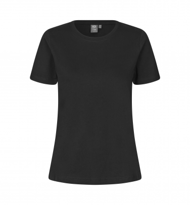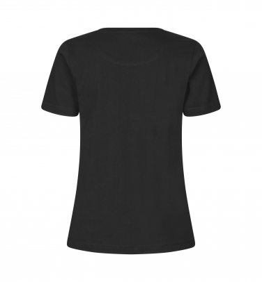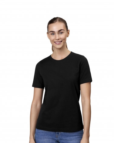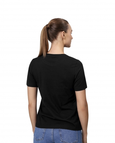 Klasyczny t-shirt z kobiecym okrągłym dekoltem, poczwórnym ściągaczem na linii szyi i taśmą na karczku i ramionach. Zachowuje swój kształt nawet po wielokrotnym praniu.