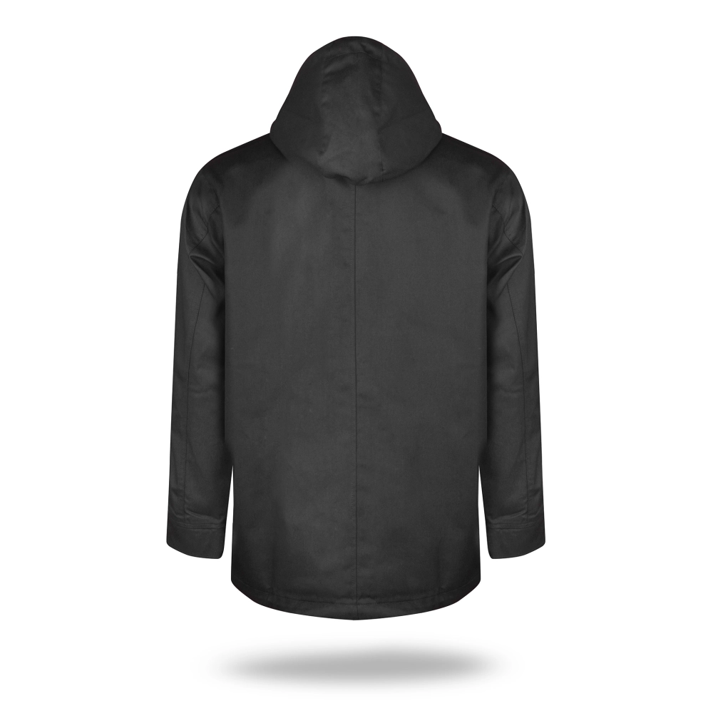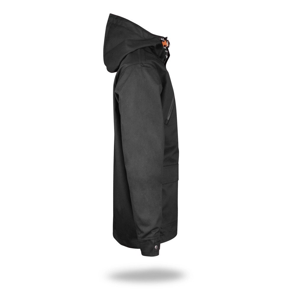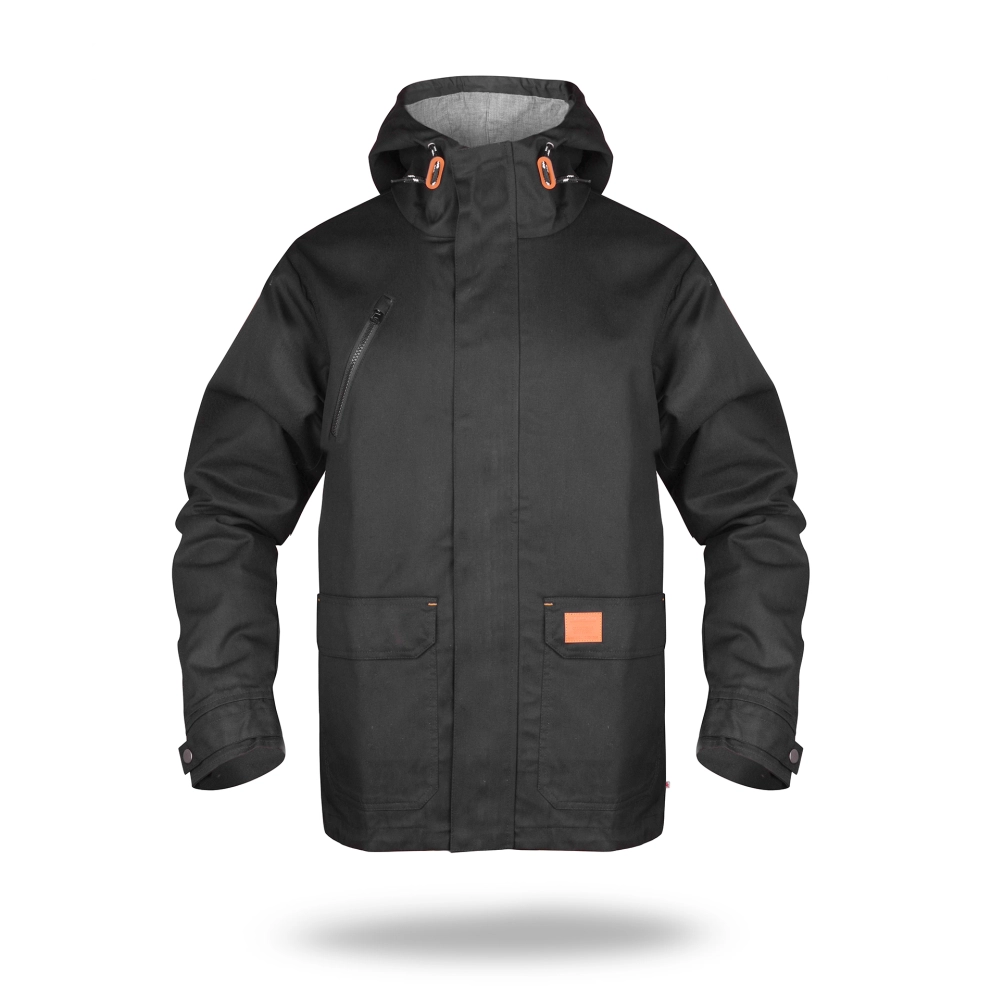 lekka kurtka wiosenno-jesienna z podszewką; materiał typu twill; materiał kontrastowy wew. kaptura; kieszeń na piersi zamykana na zamek; podwójne kieszenie dolne; wewnątrz kieszeń na dokumenty, ozdobny sznurek w regulacji kaptura