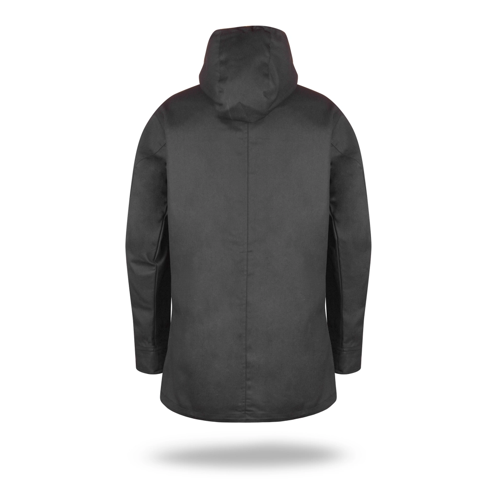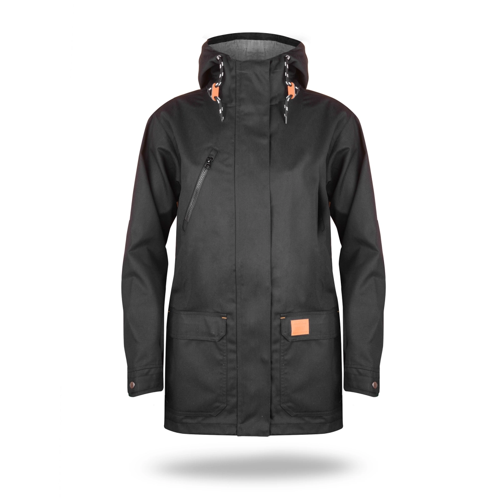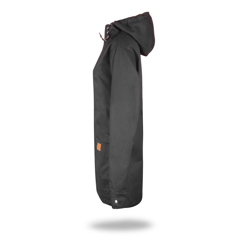 lekka kurtka wiosenno-jesienna z podszewką; materiał typu twill; materiał kontrastowy wew. kaptura; kieszeń na piersi zamykana na zamek; podwójne kieszenie dolne; wewnątrz kieszeń na dokumenty, ozdobny sznurek w regulacji kaptura