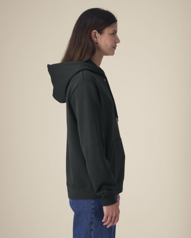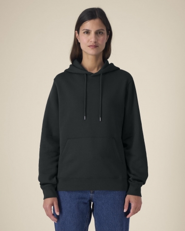 Dwuwarstwowy kaptur z tego samego materiału Okrągły sznurek w kolorze materiału z metalowymi końcówkami Końcówki wykonane w 65% z metalu pochodzącego z recyklingu Haftowane oczka Taśma wzmacniająca na karku w jodełkę Półksiężyc z tego samego materiału na karku Wszywane rękawy Kieszeń typu kangurka Ściągacz 1x1 na mankietach i u dołu Podwójne stebnowanie na mankietach i u dołu