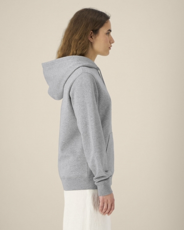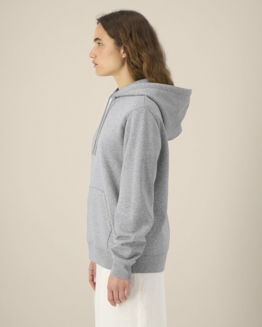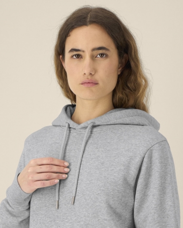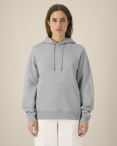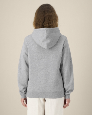 Dwuwarstwowy kaptur z tego samego materiału Okrągły sznurek w kolorze materiału z metalowymi końcówkami Końcówki wykonane w 65% z metalu pochodzącego z recyklingu Haftowane oczka Taśma wzmacniająca na karku w jodełkę Półksiężyc z tego samego materiału na karku Wszywane rękawy Kieszeń typu kangurka Ściągacz 1x1 na mankietach i u dołu Podwójne stebnowanie na mankietach i u dołu