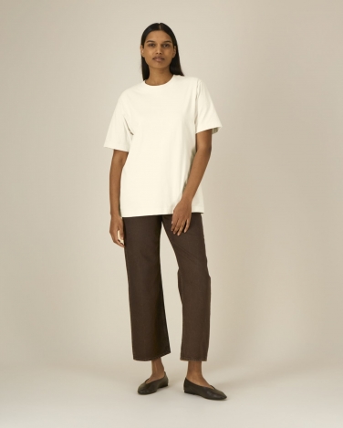 Kołnierzyk ze ściągacza 1x1 Taśma wzmacniająca na karku z tego samego materiału Wszywane rękawy Szerokie podwójne stebnowanie na mankietach i u dołu Lekko teksturowany materiał