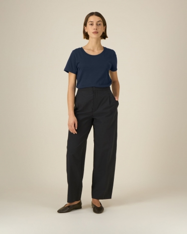 Kołnierzyk ze ściągacza 1x1 Taśma wzmacniająca na karku z tego samego materiału Wszywane rękawy Wąskie podwójne stebnowanie na mankietach i u dołu