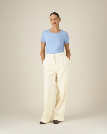 Kołnierzyk ze ściągacza 1x1 Taśma wzmacniająca na karku z tego samego materiału Wszywane rękawy Wąskie podwójne stebnowanie na mankietach i u dołu