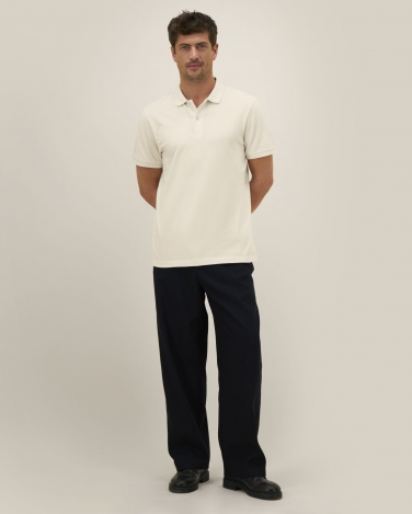 Płaski kołnierz i mankiety z dzianiny ściągaczowej Taśma wzmacniająca na karku z grubego single jerseyu Plisa z przodu z 2 guzikami w kolorze materiału Wszywane rękawy Podwójne stebnowanie na szwach ramion Rozcięcia boczne wzmocnione ryglami Wąskie podwójne stebnowanie u dołu Produkt barwiony po uszyciu: każda sztuka jest unikatowa, możliwe niewielkie różnice w kolorze