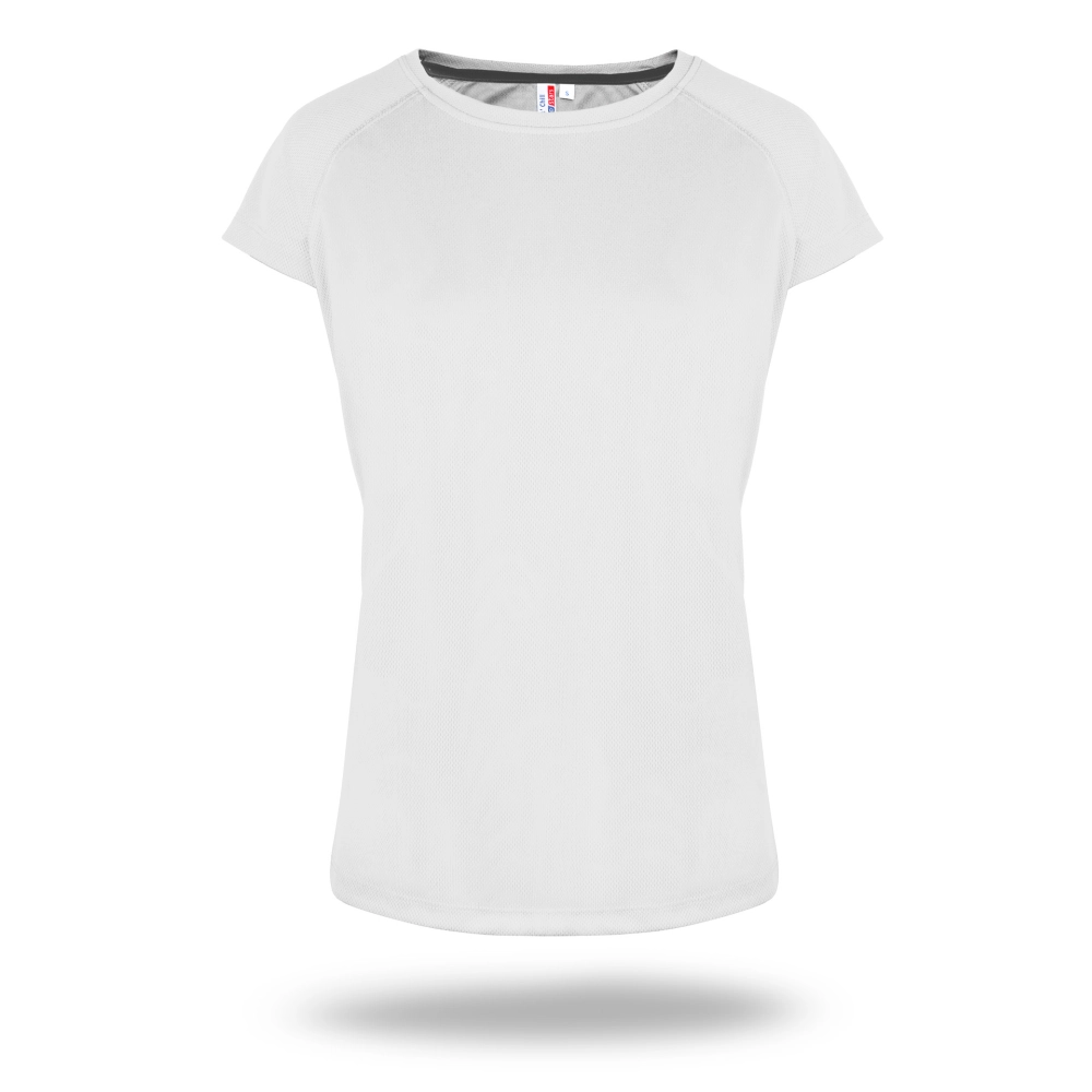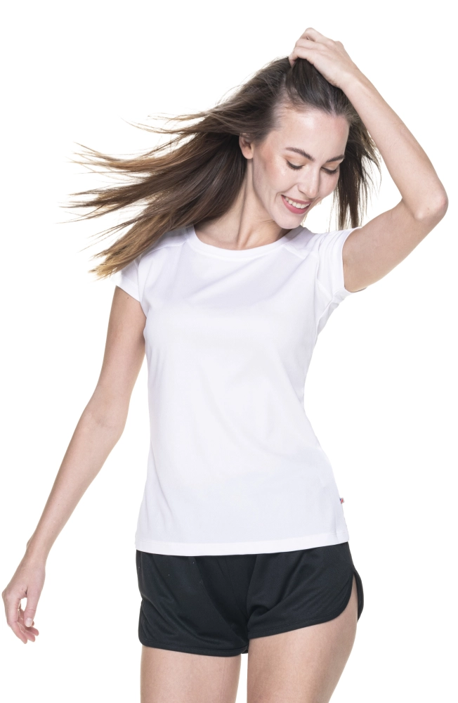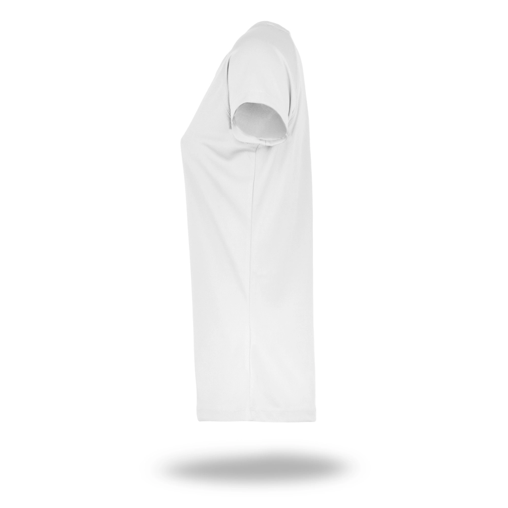 Damska sportowa koszulka z materiału wykonanego w technologii Cool Dry. Bardzo dobrze sprawdza się jako koszulka do biegania, koszulka do jazdy na rowerze i innych aktywności sportowych. Jej największą zaletą jest oddychający materiał. Odprowadza nadmiar ciepła i zapewnia suchość ciała. Wykonana z poliestru, nadaje się do znakowania w technologii sublimacji.